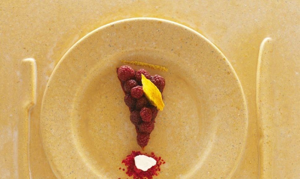 Le caillé de brebis se trouve sur bien des rivages méditerranéens. Il se marie fort bien avec la finesse très parfumée des framboises d’été et le croquant du sablé.