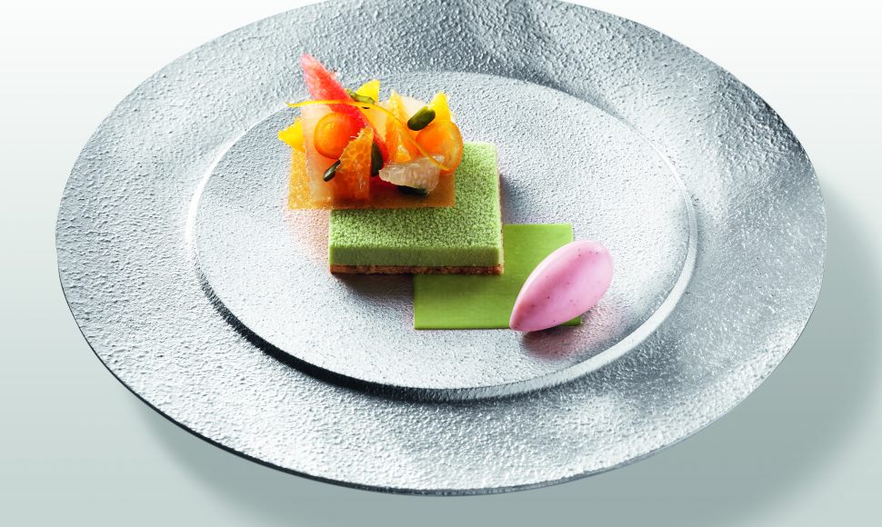 "C’est au Japon que j’ai découvert l’incroyable variété des agrumes, équilibrés ici par la douceur de la pistache travaillée en deux textures. Un dessert coloré qui en met plein les yeux !"