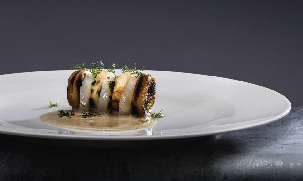 Une affinité de dimensions et de couleurs : les tranches de bananes fermes et grillées et les Saint-Jacques parfumées forment une entrée inattendue.