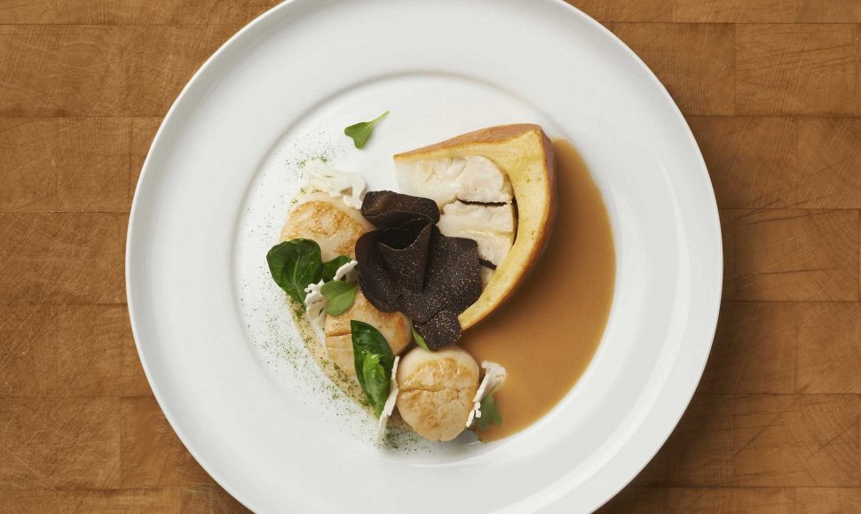 Saint-jacques de Chausey, chou-fleur en fine croûte, truffe noire