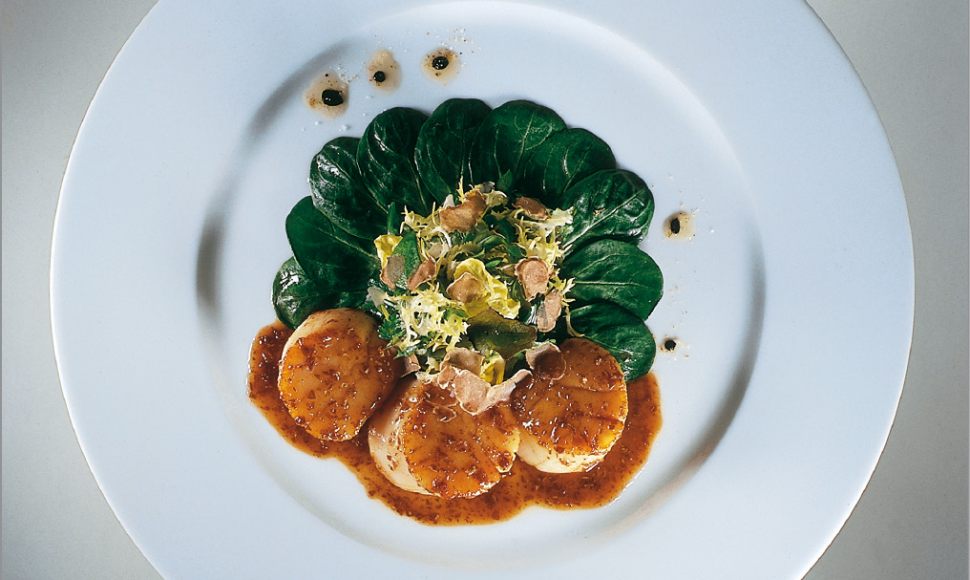 Saint-Jacques grillées au feu de bois en salade d’automne, tartufi di alba, vieux vinaigre et fleur de sel