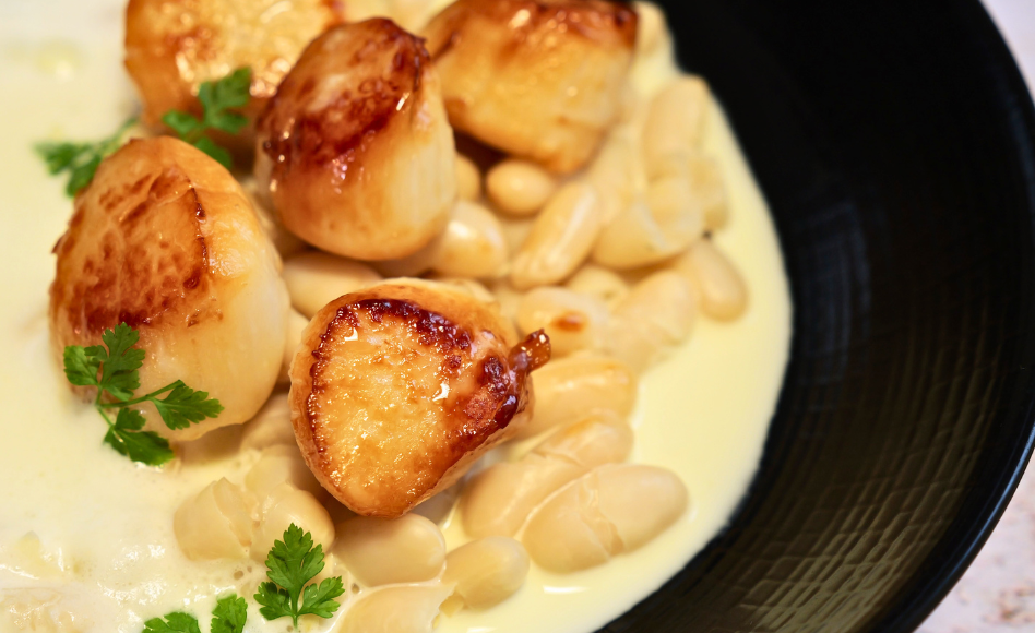 Saint-Jacques, sauce fumée au haddock et haricots blancs