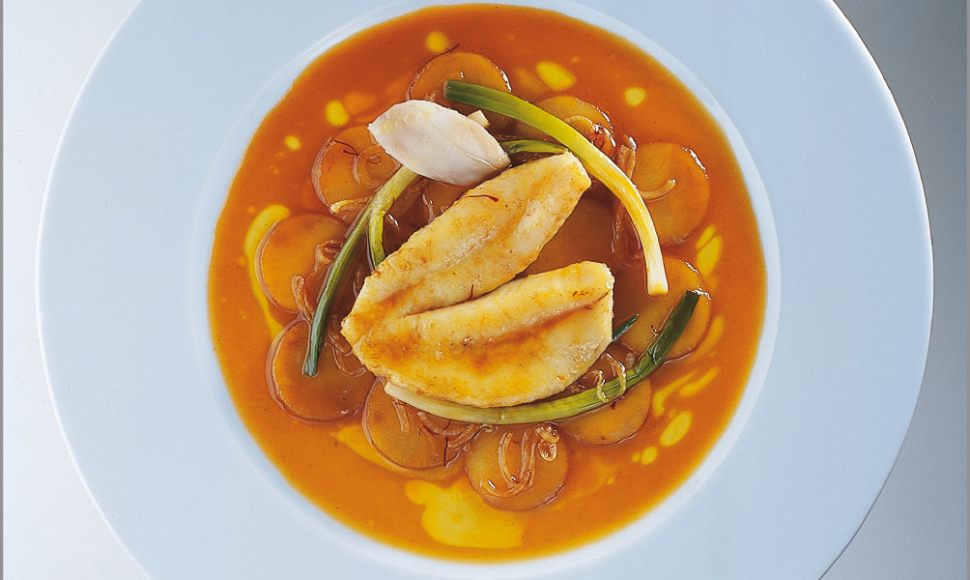 Saint-pierre de la pêche locale du jour cuisiné au four sur un lit de pommes de terre boulangère, au fumet de bouillabaisse