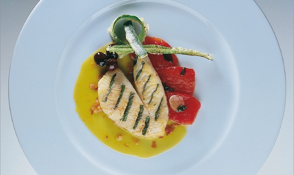 Saint-Pierre du pays clouté au basilic, jus de tomate verte et olives noires peaux de courgette en friture