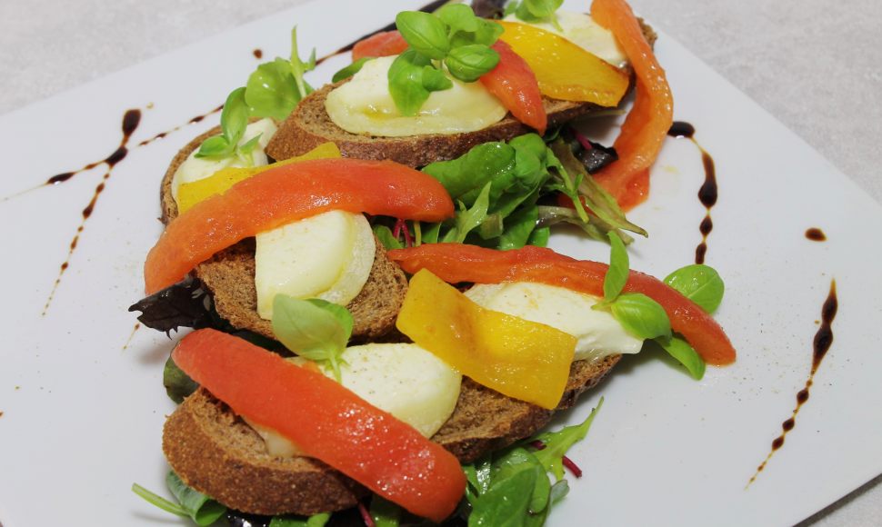 Rincer et essorer le mesclun. Le réserver dans un linge au frais. Monder ou éplucher les tomates. Les tailler en 8 quartiers dans leur longueur et les débarrasser de leurs pépins. Éplucher et tailler les poivrons en lanières de 2 cm de largeur environ. Les réserver. Chauffer un sautoir avec un filet d’huile d’olive et les faire étuver pendant 3 à 4 minutes. Les assaisonner d’une pincée de sel et de poivre du moulin. Les débarrasser sur une plaque.