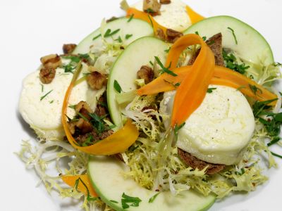 La salade au fromage de chèvre chaud n’est pas réservée qu'aux repas d’été. Elle est tout aussi agréable avec des légumes de saison et de la pomme verte qui se marie fort bien avec le chèvre. Quelques noix pour le croquant et une vinaigrette à la moutarde pour relever le tout.