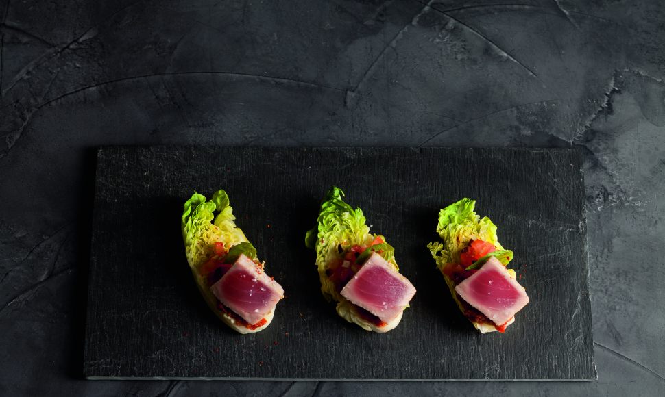 Faites le plein de fraîcheur et de saveurs avec cette salade croquante et thon snacké. Préparez d’abord la salade composée de cœurs de sucrine, tomates séchées mixées avec de l’ail et d’un mélange de cébettes et tomates fraîches. Snackez ensuite le thon dans une sauteuse, quelques secondes sur chacune des faces. Assemblez cette entrée en déposant les tranches de thon sur les feuilles de sucrine. Terminez en ajoutant la brunoise de tomates fraîches.