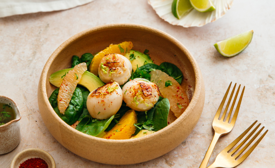 Ici, les noix de Saint-Jacques poêlées se mêlent à des suprêmes d’orange et de pamplemousse, relevés par des zestes de citron vert, de l’avocat tendre et une touche de piment d’Espelette. Une assiette fraîche, lumineuse et équilibrée pour redécouvrir la Saint-Jacques autrement.
