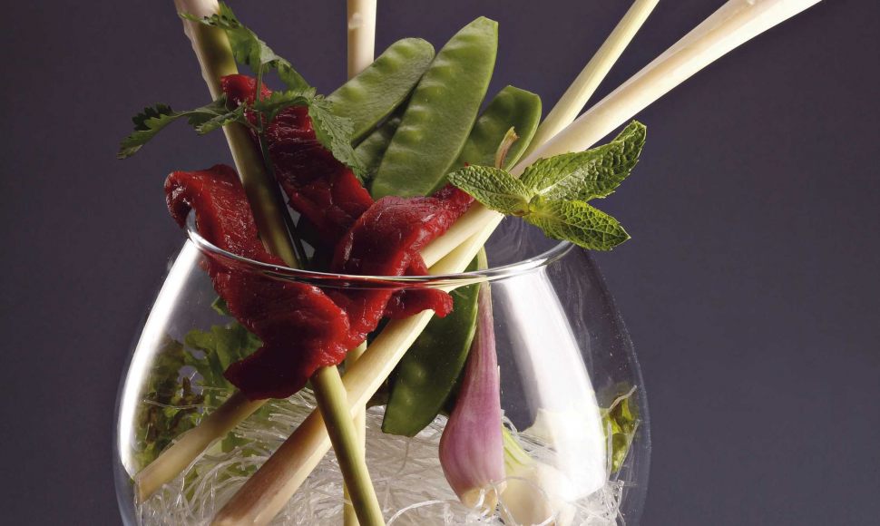 Retirez les extrémités et les fils des pois gourmands. Plongez-les dans de l’eau bouillante salée et faites-les cuire 2 min. Égouttez-les, puis plongez-les dans de l’eau glacée. Égouttez-les, puis mettez-les dans un saladier. Réhydratez les vermicelles de riz 3 min dans de l’eau bouillante. Rincez-les, puis égouttez-les.