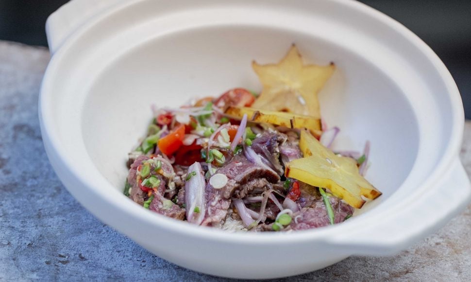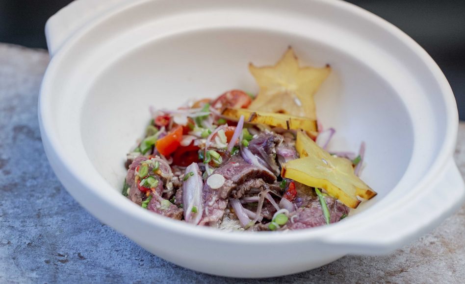 Une salade rafraîchissante vietnamienne réalisée avec des caramboles (fruit tropical en forme d'étoile, à la chair juteuse), bœuf, piment et menthe.