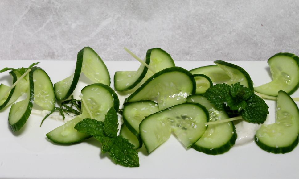 Laver et sécher les concombres. Les tailler en fines rondelles. Les réserver immédiatement si ce sont des concombres libanais. Les faire dégorger dans du sel s’il s’agit d’un concombre moyen. Rincer, sécher, effeuiller la menthe. Réserver quelques sommités pour la finition et ciseler le reste. Peler et hacher l’ail. Les réserver ensemble dans un bol au frais.