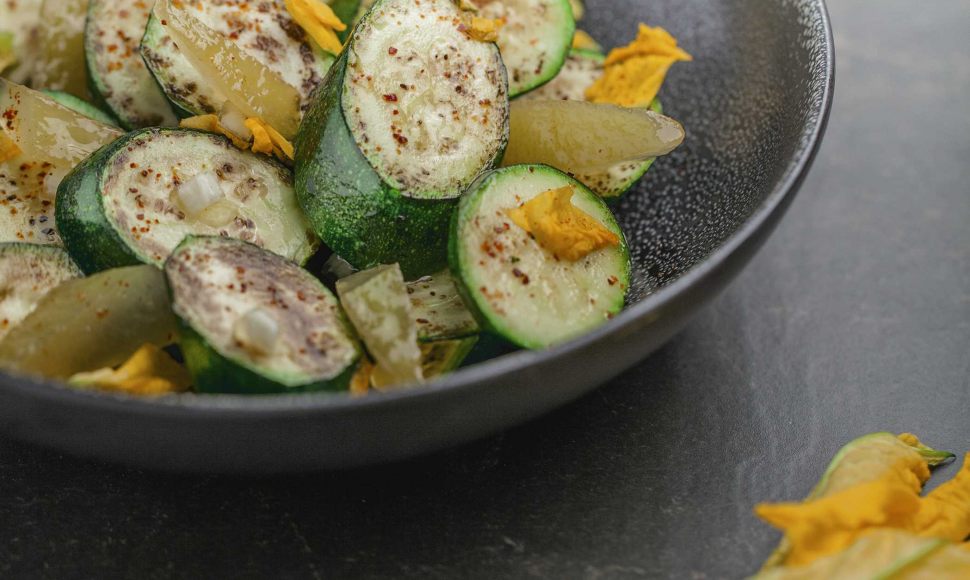 Une salade de courgettes où la douceur de l'oignon et du raisin s'équilibre avec l'amertume du citron.