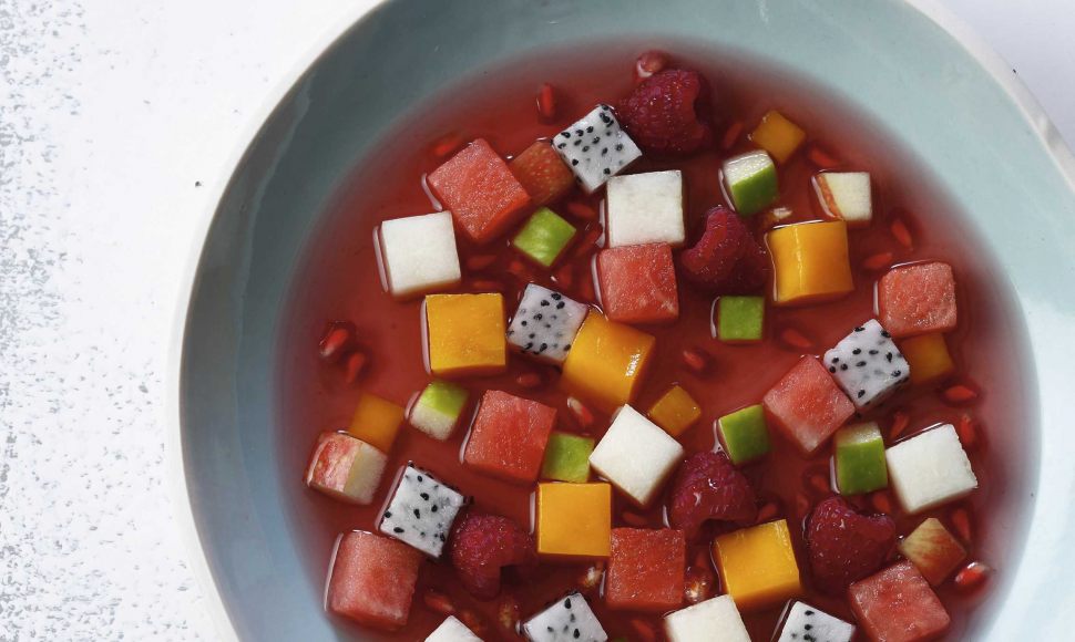 La traditionnelle salade de fruits fraîche et acidulée, ici parfumée par une infusion fraise-hibiscus.