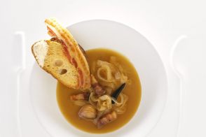 Dans un rondeau, faire suer les légumes avec l’huile d’olive. Déglacer au vin blanc, réduire à sec. Ajouter le vinaigre blanc, 2 litres d’eau, les grains de poivre, la branche de thym, la feuille de laurier, les bois de fenouil et le jus du citron. Presser les écorces au-dessus et les ajouter également. Saler. Porter à ébullition, puis laisser infuser pendant 20 minutes hors du feu.