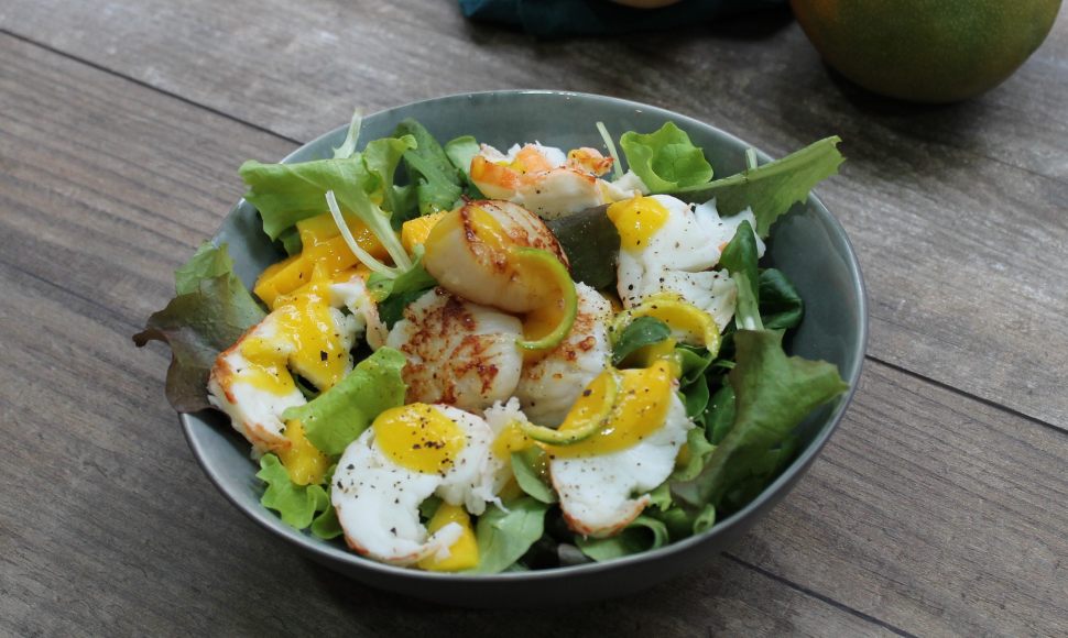 Salade de langouste et Saint-Jacques, sauce à la mangue