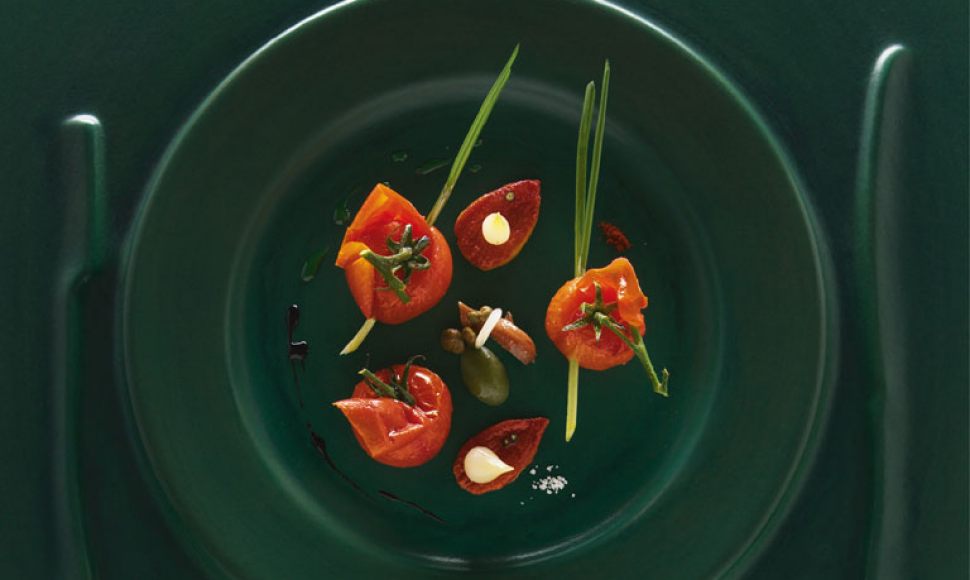 La salade de Murcie est probablement née à la fin d’un long été sur la côte de Murcie, lorsque l’on épluchait la dernière récolte de tomates avant de les stériliser. Servie en hiver, elle est composée de tomates conservées, de thon à l’huile et de petites olives noires. Voici notre interprétation.