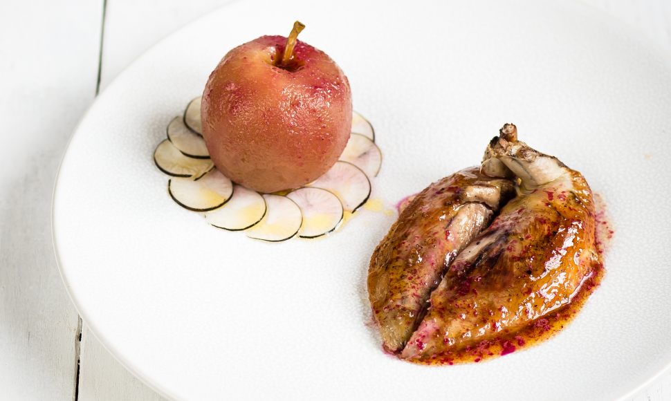 Coupez les radis noirs en tranches d’une finesse de transparence, répartissez-les sur un plat, assaisonnez-les avec le jus des carcasses à l’huile de noix. Dressez harmonieusement les filets de perdreau, les radis noirs et la pomme. Servez en saucière le reste du jus auquel vous aurez adjoint le jus de betterave. Cette « sauce » sera dispersée sur la pomme et sur le perdreau.