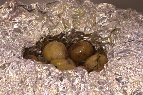 Placez les pommes de terre non épluchées dans une grande casserole d’eau froide avec 1 c. à s. de sel gris. Comptez 15 min de cuisson une fois l’eau frémissante. Égouttez-les et laissez-les refroidir.