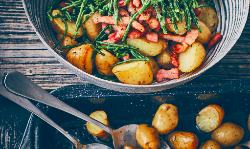 Salade de pomme de terre de la ferme de sainte marthe, lardons et salicorne