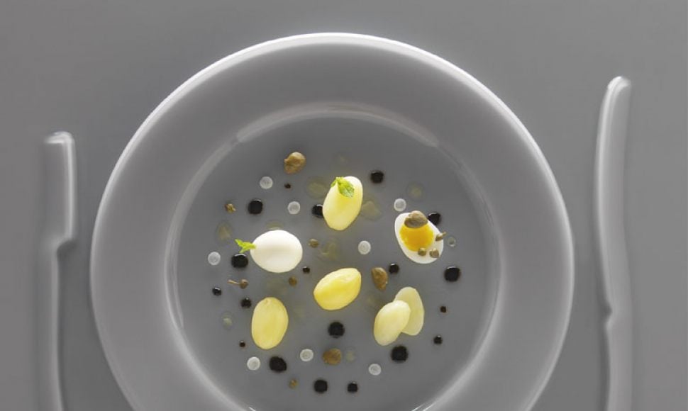 Peler les pommes de terre grenailles, les tourner au même calibre que les œufs de caille. Les cuire dans de l’eau salée. Les égoutter et les mettre dans un cul-de-poule. Le filmer et le réserver au chaud.