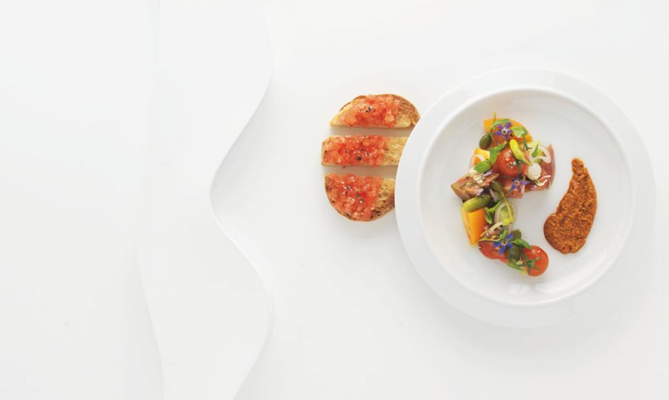 Salade de tomates du potager et « pa amb tomàquet », romesco de tarragona pilé au mortier