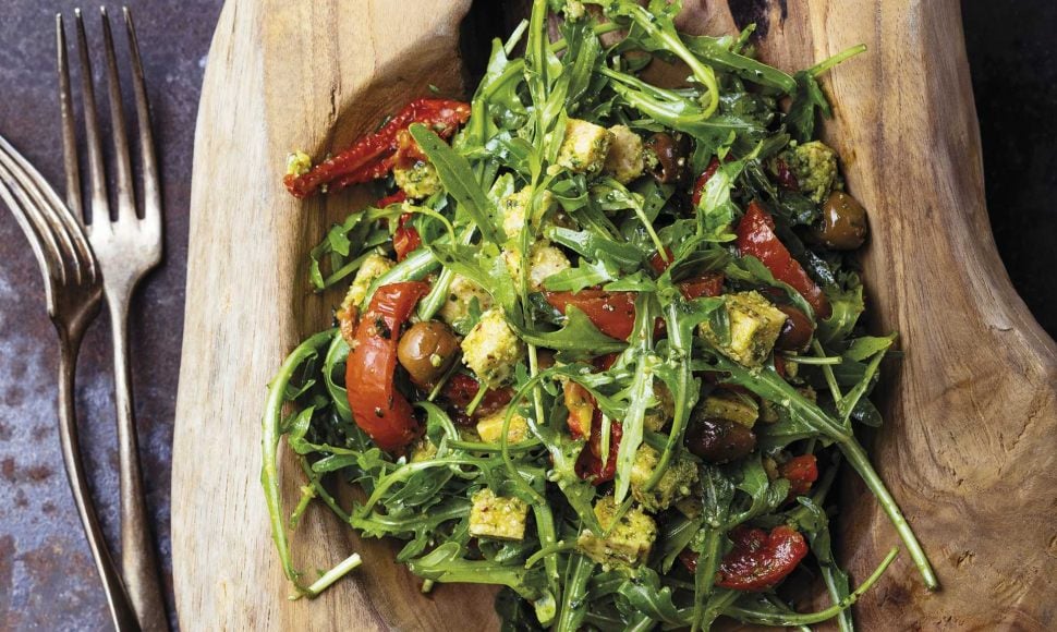 Coupez les tomates séchées et les olives en quatre. Mélangez tous les ingrédients avec 80 g de roquette et le pistou dans un saladier.