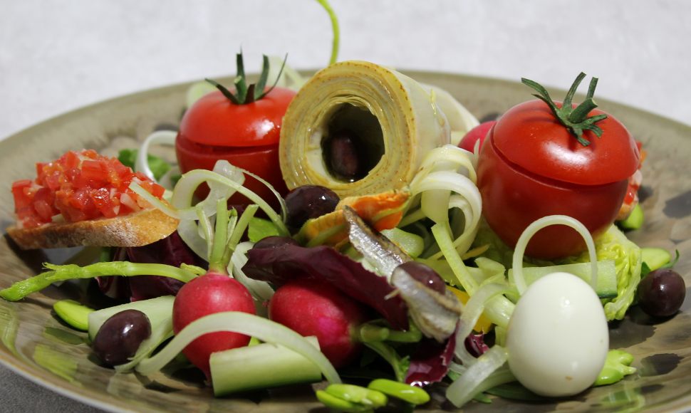 Pour l’auteur d’une recette parue dans la revue Pot-au-feu en 1903, c’est la tomate ou « pomme d’amour » chère aux Méridionaux qui tient le rôle principal dans la salade niçoise. Les œufs durs qui y figurent chez Jacques Médecin en 1972 dans sa Cuisine du comté de Nice semblent être une addition récente.