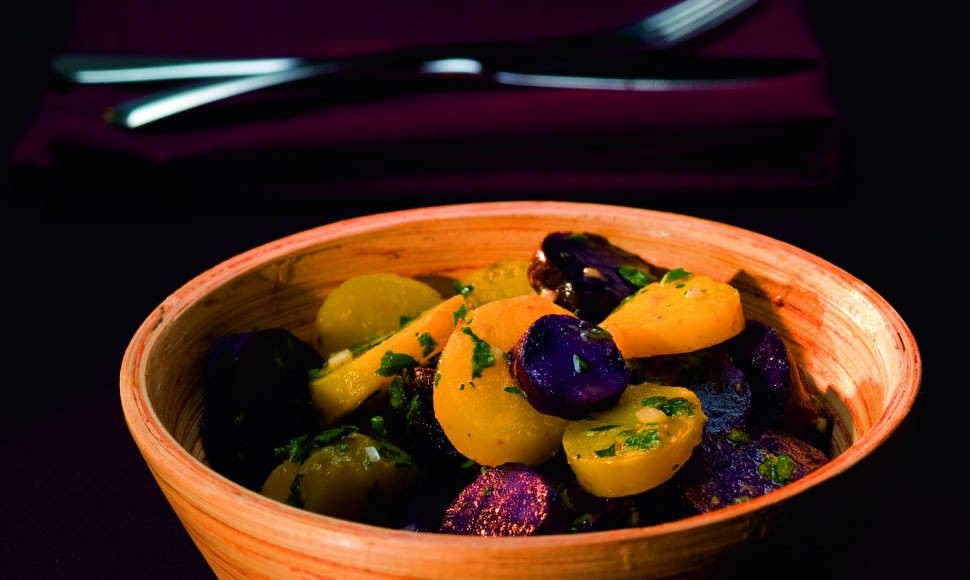 La pomme de terre, tout le monde l'aime. Pour changer des traditionnelles pommes sautées ou pommes au four, réalisez avec Alain Ducasse une salade tiède de pommes de terre ratte et vitelotte. Après les avoir cuites à l'eau et parfumées d'ail entier, de thym et de laurier, il ne vous reste plus qu'à préparer la vinaigrette à base de vinaigre de Xérès, de moutarde de Meaux et d'huile d'olive. Une recette simple mais originale qui ravira petits et grands.