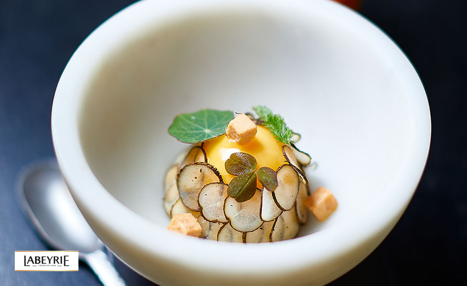 Dresser dans chaque assiette un peu de crème de foie gras, disposer un jaune d'oeuf au centre, recouvrir de fines lamelles de salsifis.