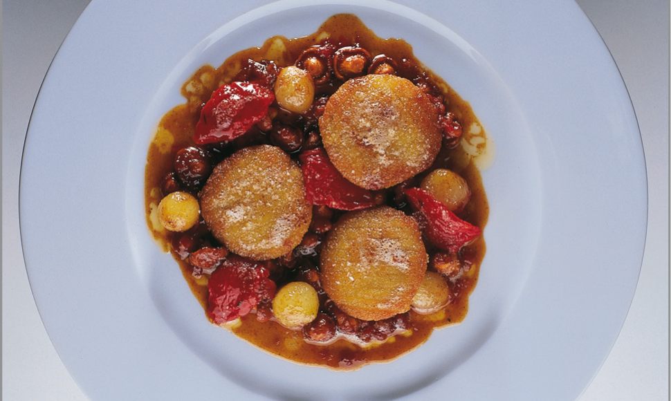 Saltimbocca de veau de lait, girolles et oignons nouveaux saucés de jus de veau tomaté