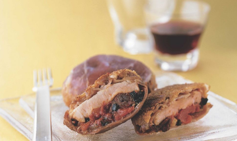 Des filets mignons de veau, tranches de jambon cru, légumes avec une panure à l'anglaise et une garniture de tomates, oignons.
