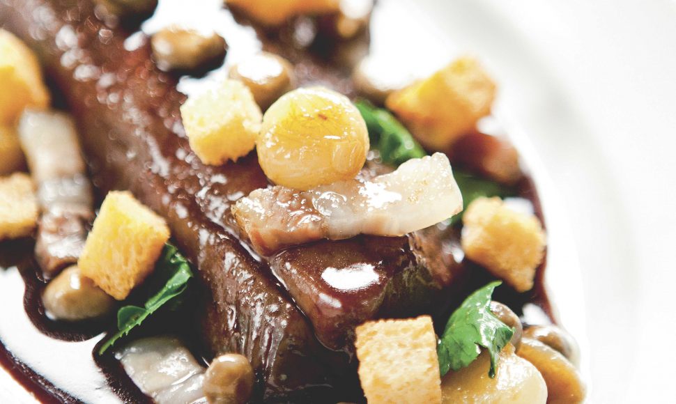 Une recette de sandre avec une sauce brune au vin rouge et légumes accompagné d'une garniture (oignons, poitrine fumée, champignons etc).