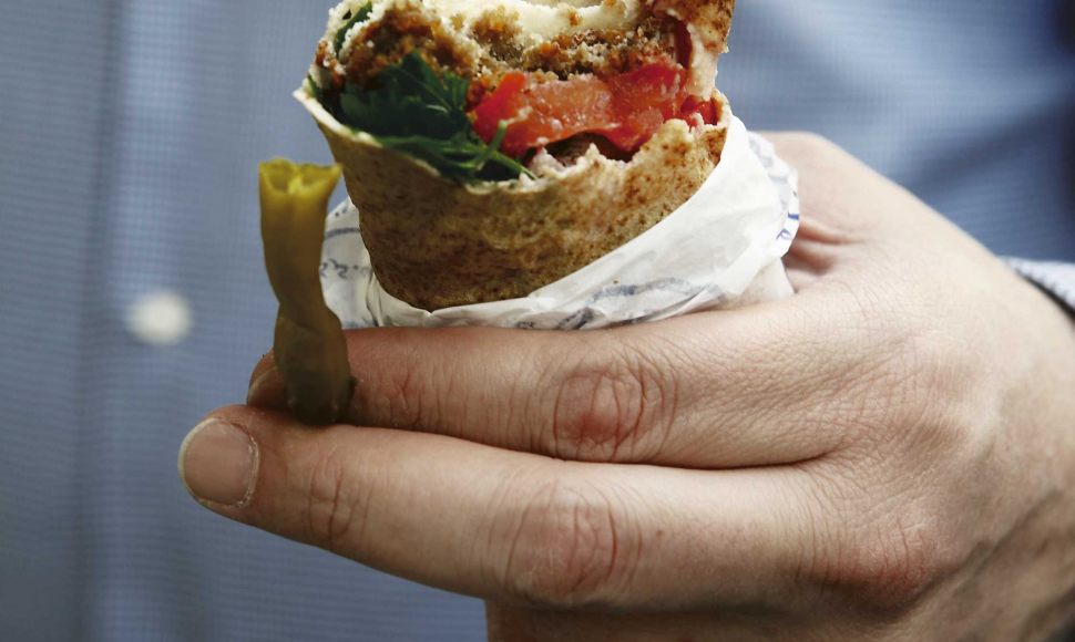 Dans les pains ouverts, répartissez un peu de sauce tarator à l’aide d’une cuillère, quelques tranches de tomates, quelques feuilles de persil et les radis coupés en demi-lunes. Ajoutez 2 falafels en les écrasant légèrement avec le pouce. Refermez le sandwich.