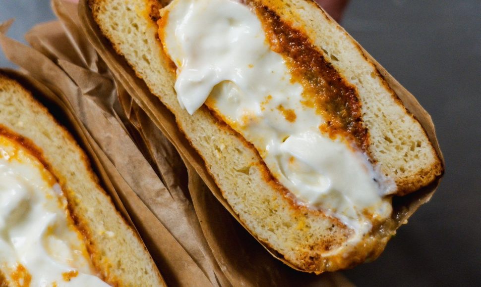 Sandwich pain perdu burrata, piment rouge et aubergines