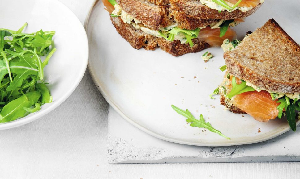 Des sandwichs de pain complet au saumon fumé, fromage frais, riquette et persil.