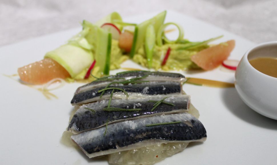 L'escabèche est une marinade à base de vinaigre et d'huile propre au bassin méditerranéen. Dans cette recette c'est la sardine qui est cuisinée ainsi accompagnée d'une surprenante gelée au bouillon escabèche. Le tout servit avec un guacamole parfumé, des légumes croquants et des pomélos juteux.