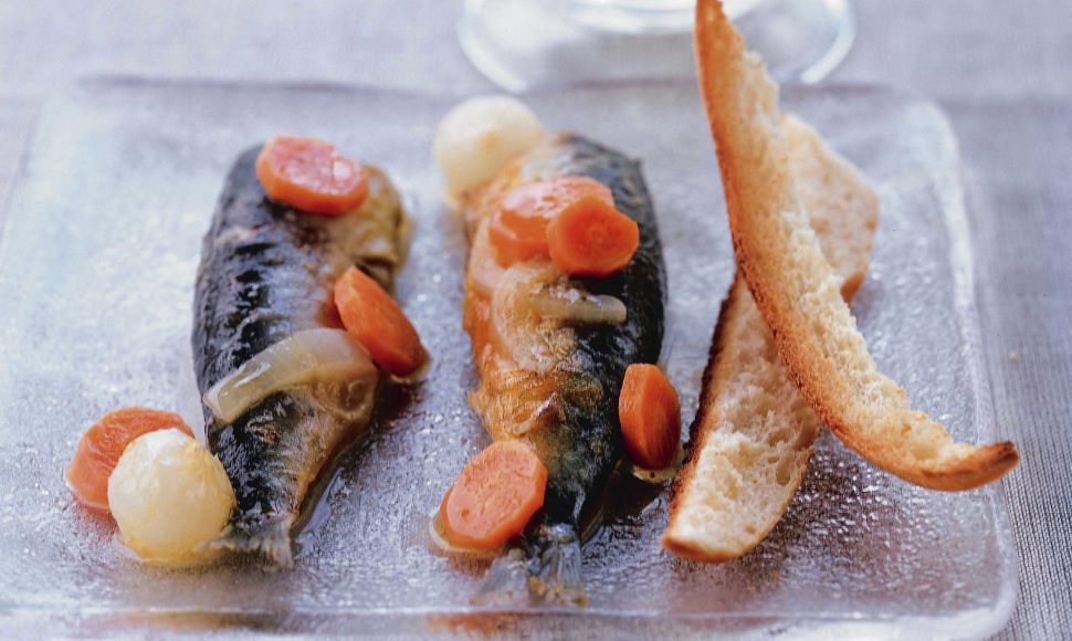 Une entrée de sardines en escabèche : carottes, oignons, vin blanc et vinaigre d'alcool.