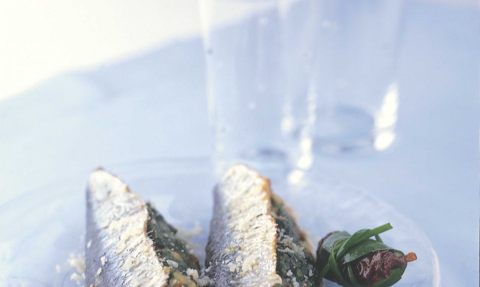 Des sardines farcies au pain, épinards, œufs, tomates et parmesan avec des herbes;