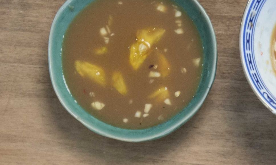 Pelez l’ananas et coupez-le en petits triangles. Pelez l’ail et râpez-le. Pelez l’échalote et émincez-la. Mélangez l’ananas, l’ail, l’échalote, le mam nem, l’huile de tournesol, le sucre et l’eau dans une casserole.