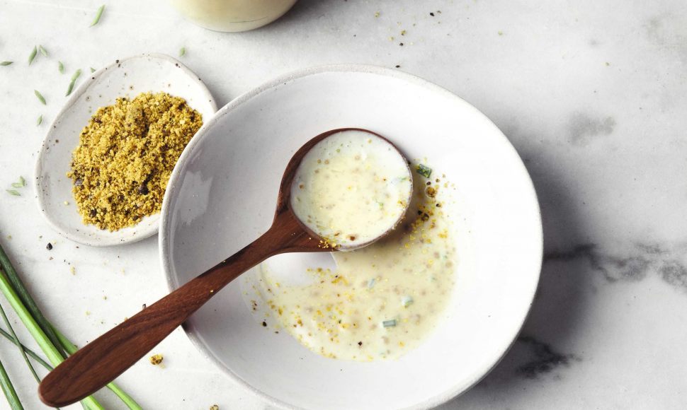 Une sauce pour assaisonner vos salades à base de yaourt nature, lait ribot, oignon, ail, moutarde et ciboulette.