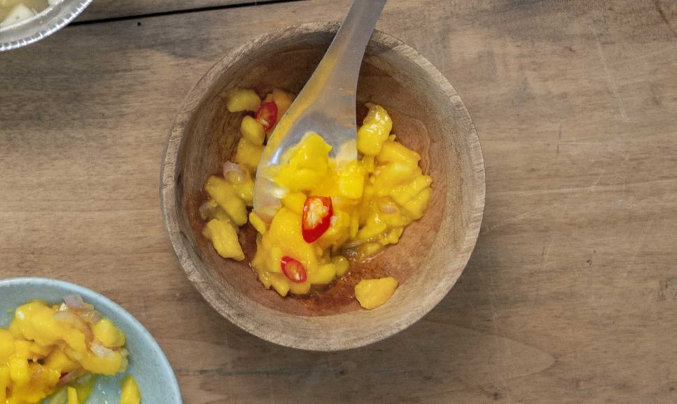 — Coupez la mangue en brunoise. Pelez l’échalote et ciselez-la très finement. Épépinez le piment oiseau et hachez-le finement. Pelez la gousse d’ail et râpez-la à l’aide d’une Microplane®. Mélangez la mangue, l’échalote, le piment et l’ail dans un bol. Assaisonnez avec le sucre, le sel, le jus de citron vert et le nuoc mâm.