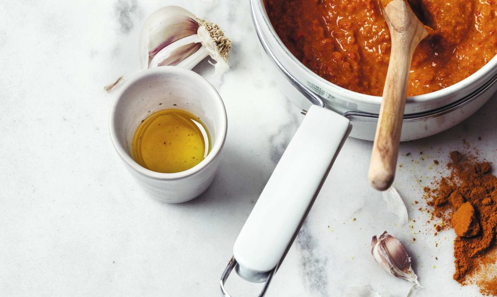 Dorez l’ail dans un filet d’huile d’olive. Ajoutez les poivrons, le piment oiseau, le vinaigre, le concentré de tomate et l’eau.
