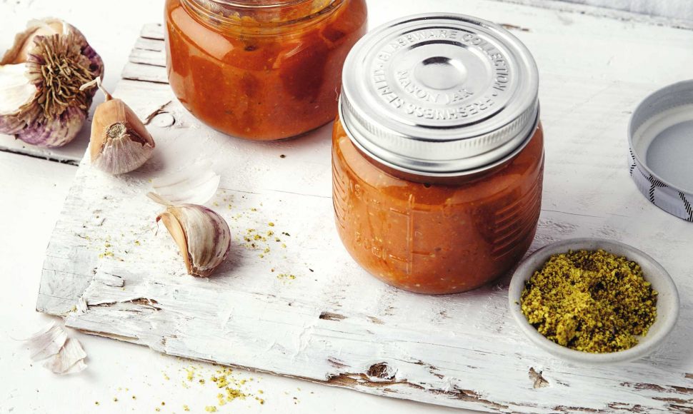 Ajoutez la poudre magique. Retirez le romarin, puis donnez un coup de mixeur plongeant. Débarrassez dans un bocal au frais, ou stérilisez-le pendant 45 min à 100 °C (voir coulis de tomate).