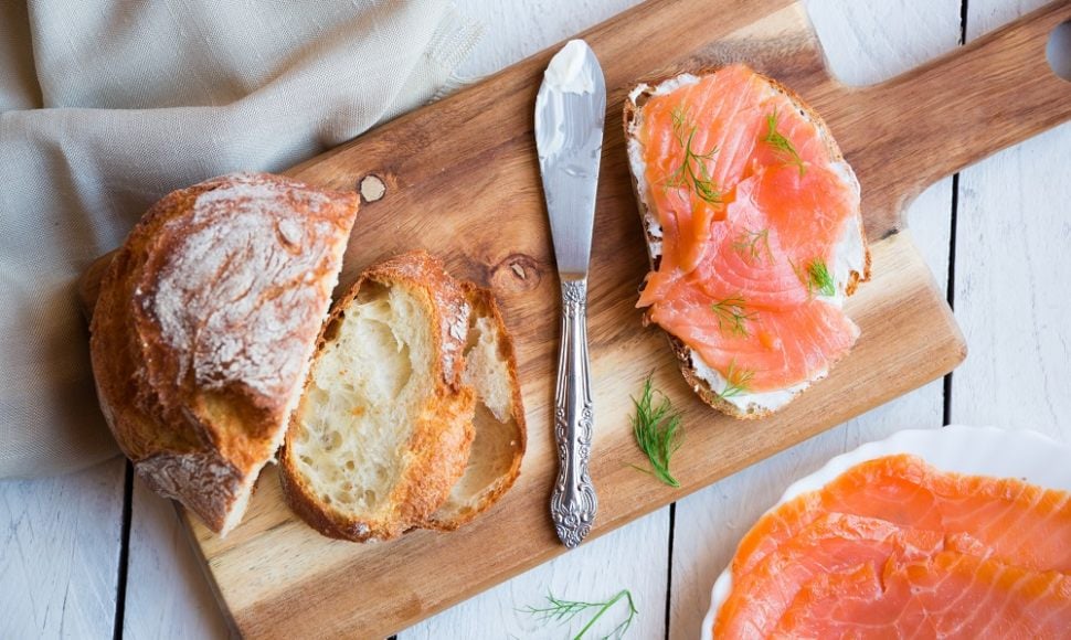 Des bouchées de saumon sur des tranches de pain complet avec une sauce au yaourt grec et aneth.