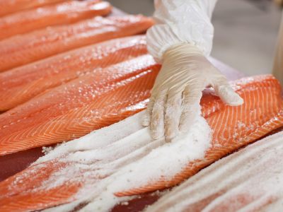 Retirer les arêtes du filet de saumon. Mélanger le gros sel et le sucre et en étaler une couche dans un plat. Déposer le filet de saumon dessus. Verser le reste du mélange sucre / sel et bien l’étaler dessus. Filmer le plat, le déposer au réfrigérateur et laisser mariner pendant 1 heure en retournant le filet. Pendant ce temps, le saumon va cuire légèrement, d’où ce terme de coction. Avant de l’utiliser, rincer soigneusement le filet de saumon sous le robinet afin de le débarrasser de toute trace de sel et de sucre. Puis le sécher dans un torchon propre.