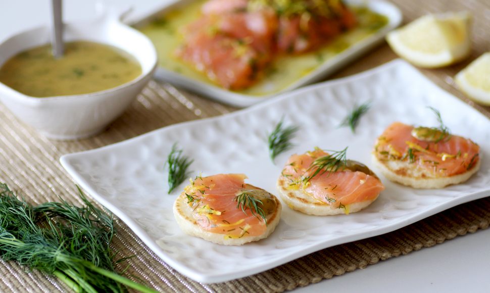 Déposer les tranches de saumon sur des blinis et dresser sur une assiette. Servir avec la sauce gravlax.