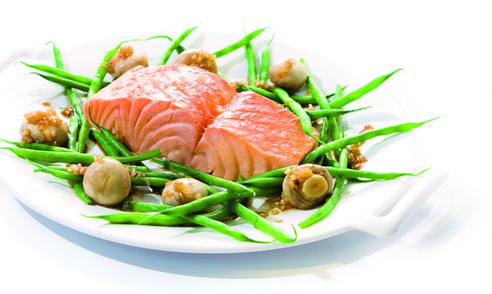 Saumon poché, haricots verts et champignons boutons