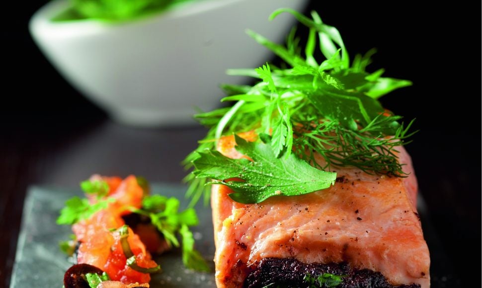Retirez les arêtes du saumon avec une pince à épiler. Ciselez le basilic, l’estragon et l’aneth. Dans un bol, mélangez la tapenade avec les herbes, du poivre et l’huile. Mettez le tout dans une poche à douille avec une grosse douille non cannelée. Insérez un long couteau fin sous la peau de chaque pavé de saumon, incisez sur une largeur d’environ 2 cm, d’un côté à l’autre. Insérez la tapenade dans chaque incision. Appuyez sur la peau avec les doigts pour bien répartir la farce.