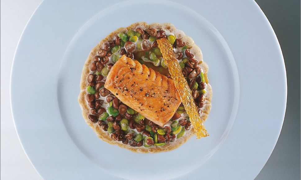 Saumon sauvage de l’adour en épais filet au four, mousserons des prés et févettes légèrement crémés, la peau croustillante