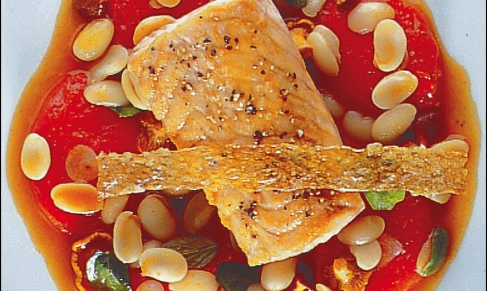 Saumon sauvage en tranche épaisse cocos, girolles, suc de tomate
